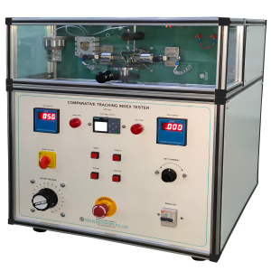 Tracking Index Test Machine from SCR ELEKTRONIKS is a popular product for checking compliance of solid insulating material as per IEC 60112, UL 746A, ASTM D3638 and DIN 53480. With a high voltage applied between two platinum electrodes, the solid insulating part is placed such that there is a 4mm gap between the electrodes touching the insulating material under test. The high voltage is settable up to 600V or 1200V depending on model. Drops of contaminant are poured on to the electrodes while voltage is applied. With time, it’s evaluated on the criteria outlined in IEC 60112 or the equivalent national standard with which the insulating material is required to comply with.